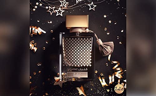 Rasasi Qasamat “Bareeq” Eau de Parfum opening notes are fresh, where bergamot, orange, and green apple give way to the heart notes of caramel, clove, and saffron. The rose, jasmine, violet, and chamomile lend this perfume an ingratiating oriental nuance. A robust base of strong, smoky, and woody notes of vetiver, ambergris, moss, and cedar wood is held together by musk and buttressed by the leather accord, which gives this long-lasting perfume an aura of supreme confidence