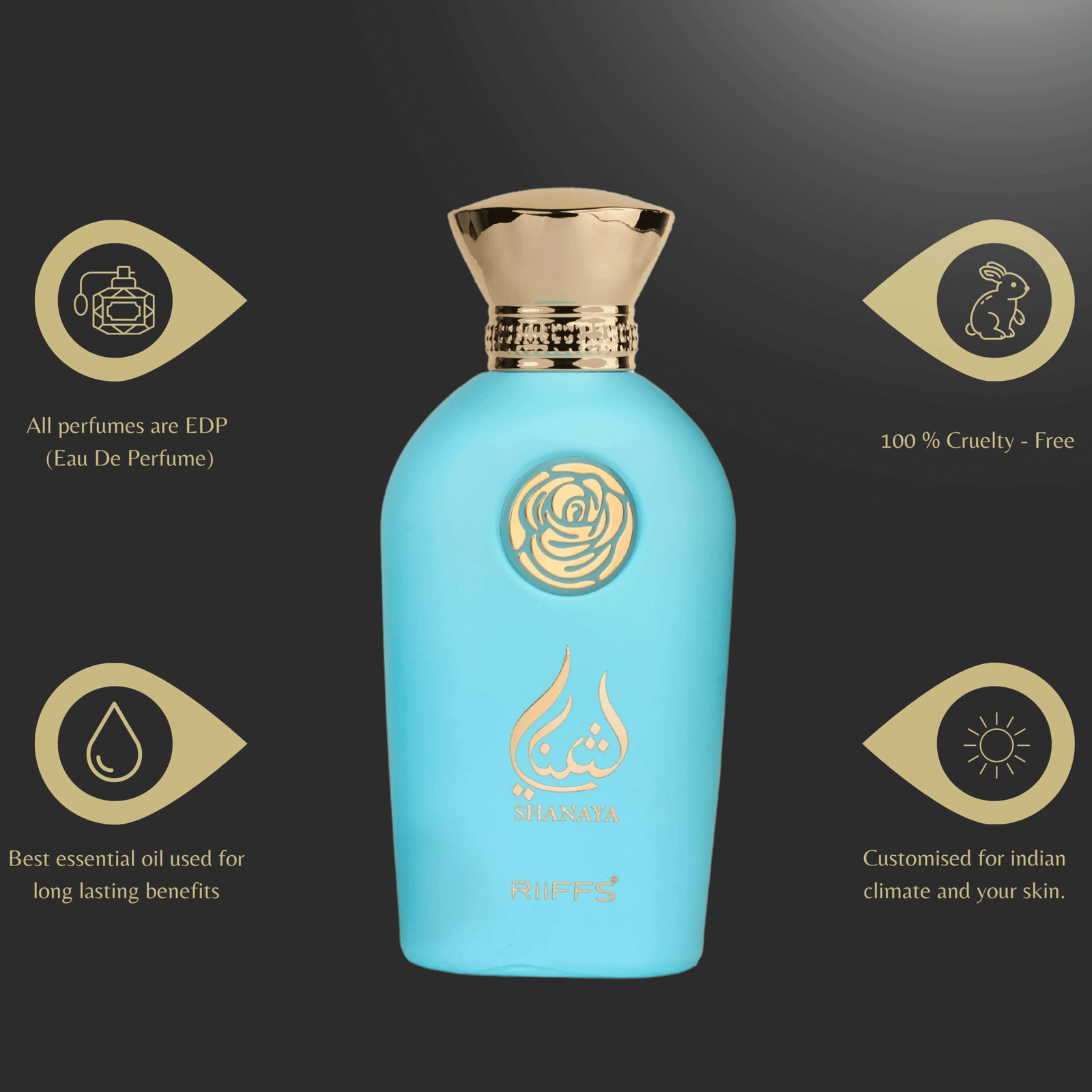 iiFFS Shanaya is an Eau de Parfum designed for women, described as a delicate, feminine, and radiant floral scent with a fresh, sophisticated, and warm profile. The fragrance features floral notes like jasmine and rose, paired with fruity and fresh top notes, and settles into a sensual base of vanilla, amber, and musk. It is known for its long-lasting wear, elegant design, and is suitable for both daily use and special occasions.